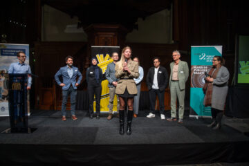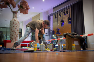Hein van Houten, de action painter op de Nacht van de Lobbyist, nu ook met woorden aan het werk. Komt-ie: