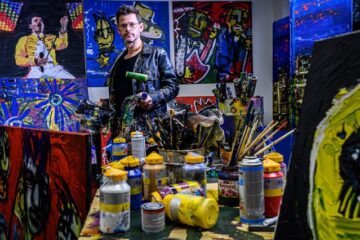 Op zich doe ik het al best weer een tijdje, meer dan twintig jaar inmiddels, denk ik zo. En het was eigenlijk de bedoeling helemaal niet, het is gewoon zo gelopen. Ik was grafisch ontwerper, ha, en dacht te gaan werken voor een prestigieus reclamebureau, maar man, dat werd één groot drama, wat er onder meer toe leidde dat ik bij verschillende mensen schulden had. Ik had het geld helemaal niet om die allemaal af te betalen, maar ze vonden het oké als ik in plaats daarvan een schilderij voor ze maakte. Dat bleek ik dus te kunnen. En toen ontmoette ik ook nog eens mijn vrouw, nou ja, mijn vriendin toen eerst natuurlijk, en kwam ik via haar in het midden van het land terecht, in Maasbommel. Woon ik nu nog. Nou goed, ik ben eigenlijk zonder opleiding begonnen met action painting, ik zou mezelf eerst ook helemaal geen kunstenaar hebben willen noemen, maar op een gegeven moment, ja, dan krijg je dus toch een naam. De Herman Brood van het land van Maas en Waal. Nou vooruit.